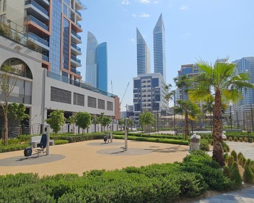 حدائق مجاورة، ممرات مظللة، ومساحات منسقة تم دمجها ضمن المخطط العمراني للمنطقة.